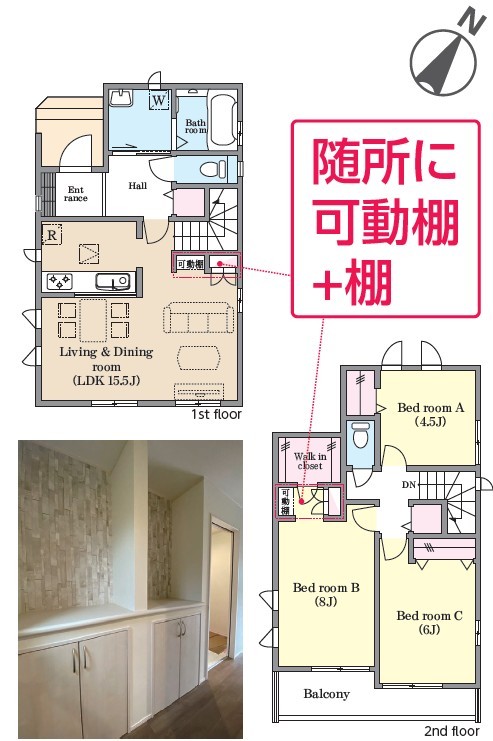 | 間取 | 3LDK + WIC・可動棚・ホール収納・玄関収納 (LDK15.5帖、洋室8帖、洋室6帖、洋室4.5帖) | ||