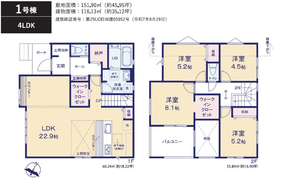 | 間取 | 4LDK + 土間収納、玄関ホール収納、2WIC (LDK22.9帖、洋室8.1帖、洋室5.2帖、洋室5.2帖、洋室4.5帖) | ||