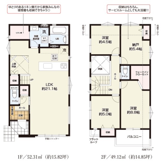 | 間取 | 3SLDK + 吹き抜け、W.I.C (LDK21.1帖、洋室8.8帖、洋室5.0帖、洋室4.5帖、S5.4帖) | ||