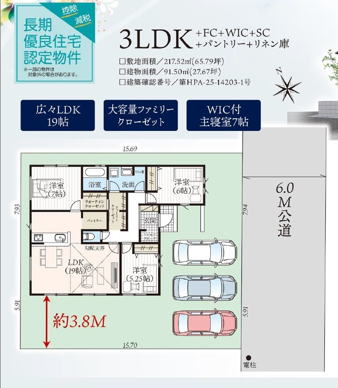 | 間取 | 3LDK + パントリー、SIC、ファミリークローゼット、WIC (LDK19帖、洋室7帖、洋室6帖、洋室5.25帖) | ||