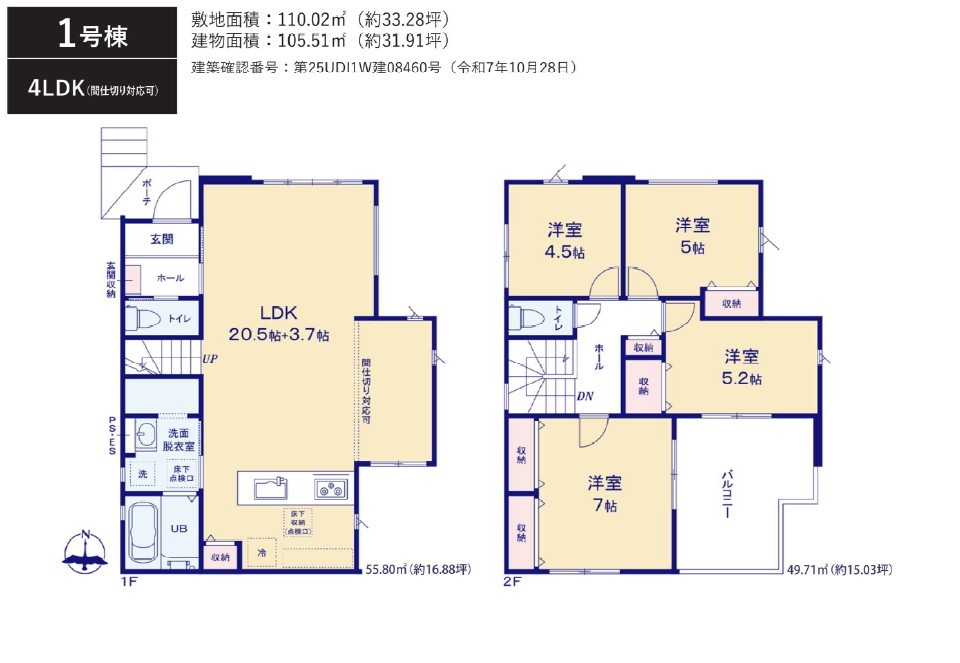 | 間取 | 4LDK + キッチン収納、2階ホール収納 (LDK24.2帖、洋室7帖、洋室5.2帖、洋室5帖、洋室4.5帖) | ||
