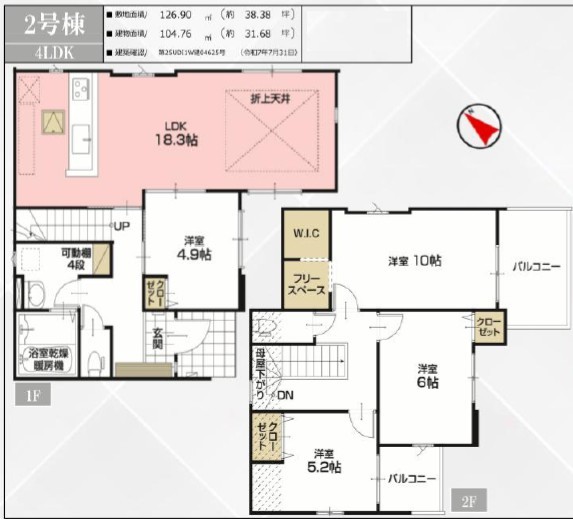 | 間取 | 4LDK + WIC・フリースペース・折上天井 (LDK18.3帖、洋室4.9帖、洋室10帖、洋室6帖、洋室5.2帖) | ||