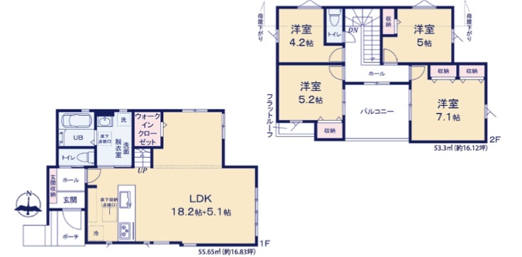 | 間取 | 4LDK + WIC、間仕切り対応 (LDK23.3帖、洋室7.1帖、洋室5.2帖、洋室5帖、洋室4.2帖) | ||