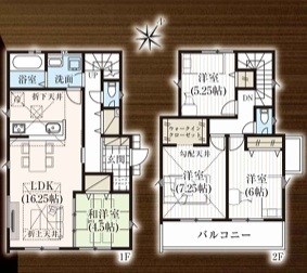 | 間取 | 4LDK + W.I.C、SC (LDK16.25帖、和室4.5帖、洋室7.25帖、洋室6帖、洋室5.25帖) | ||
