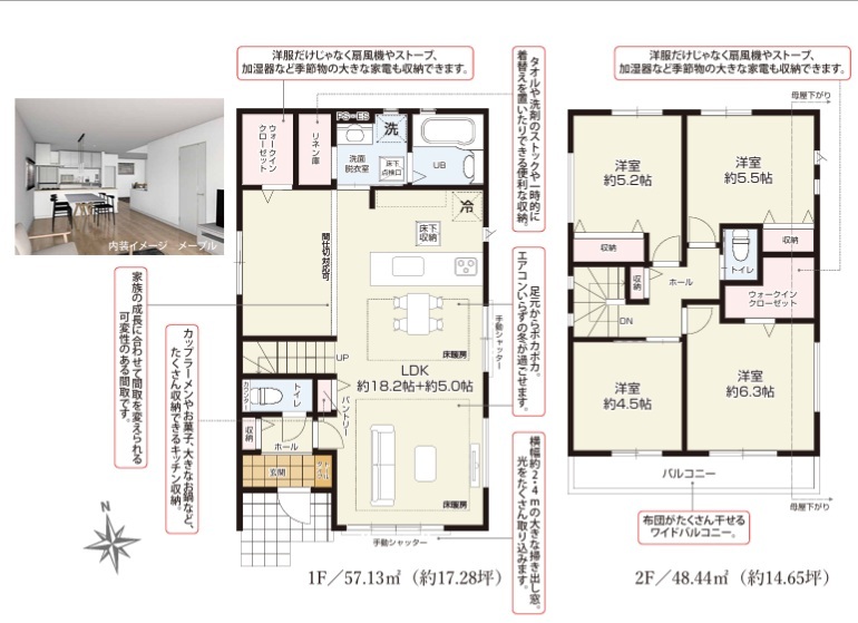 | 間取 | 4LDK + 間仕切り対応、W.I.C、リネン庫、床暖房 (LDK23.2帖、洋室6.3帖、洋室5.5帖、洋室5.2帖、洋室4.5帖) | ||