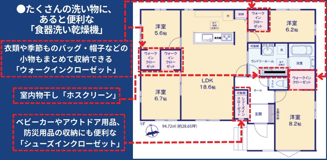| 間取 | 4LDK + キッチン収納、アイランドキッチン、SIC、4WIC (LDK18.6帖、洋室8.2帖、洋室6.7帖、洋室6.2帖、洋室5.6帖) | ||
