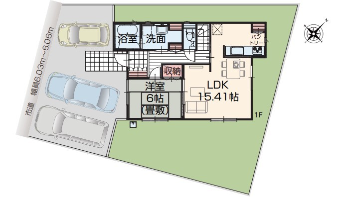 | 間取 | 4LDK + パントリー、玄関ホール収納付き・ワイドバルコニー・庭付き (LDK15.41帖、和室6帖、洋室8帖、洋室6帖、洋室6帖) | ||