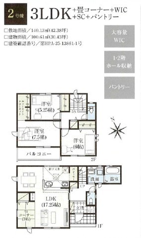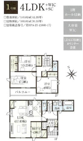 | 間取 | 3LDK~4LDK + SIC・WIC・カウンター・リビング収納・2階ホール収納 (LDK17.43帖、和室3帖、洋室7.5帖、洋室6帖、洋室5.25帖) | ||