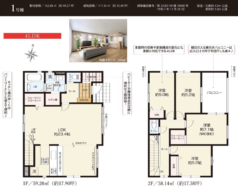 | 間取 | 4LDK + 土間収納、リネン庫、2WIC (LDK23.4帖、洋室7.1帖、洋室5.2帖、洋室5.2帖、洋室5帖) | ||