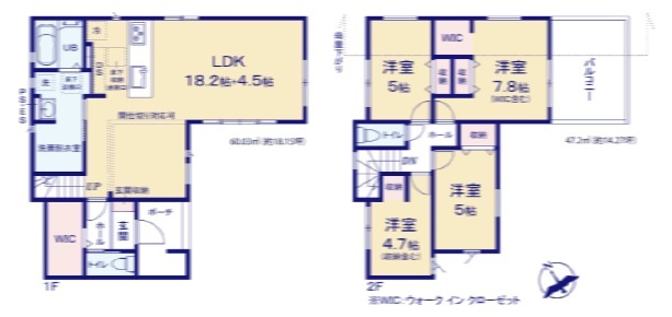 | 間取 | 4LDK + 間仕切り対応、W.I.C (LDK22.7帖、洋室7.8帖、洋室5帖、洋室5帖、洋室4.7帖) | ||