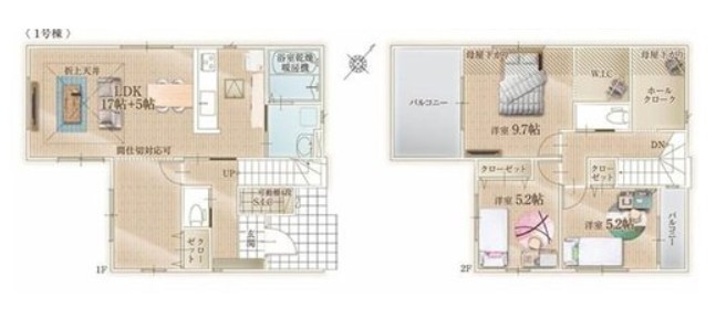 | 間取 | 3LDK + SIC、2階ホール収納、WIC、2面バルコニー (LDK22帖、洋室9.7帖、洋室5.2帖、洋室5.2帖) | ||
