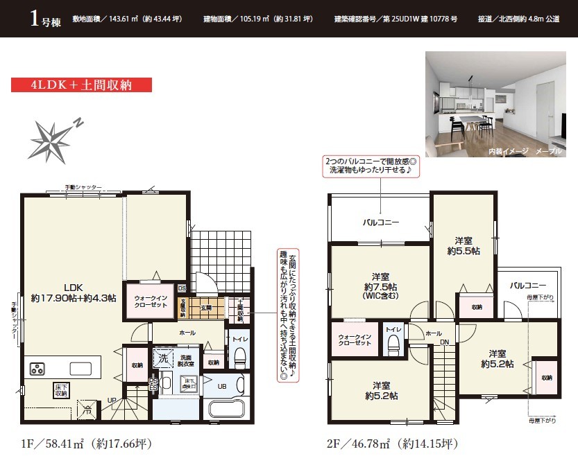 | 間取 | 4LDK + 土間収納、キッチン収納、玄関ホール収納、2WIC (LDK22.2帖、洋室7.5帖、洋室5.5帖、洋室5.2帖、洋室5.2帖) | ||