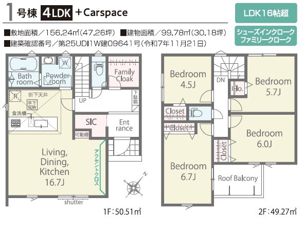 | 間取 | 4LDK~4LDK + リビング可動棚、SIC、ファミリークローゼット (LDK16.7帖、洋室6.7帖、洋室6帖、洋室5.7帖、洋室4.5帖) | ||