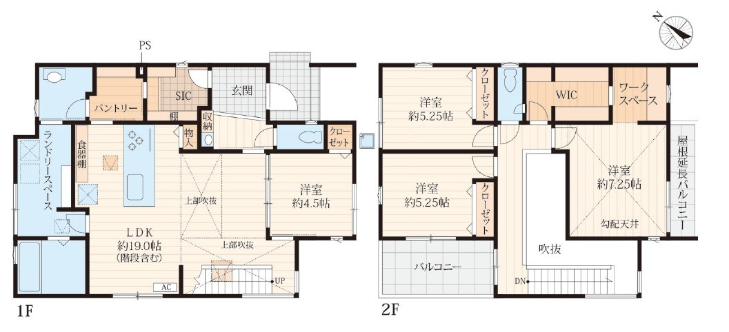 | 間取 | 4LDK + SIC・WIC・パントリー・リビング階段・ランドリースペース (LDK19帖、洋室4.5帖、洋室7.25帖、洋室5.25帖、洋室5.25帖) | ||