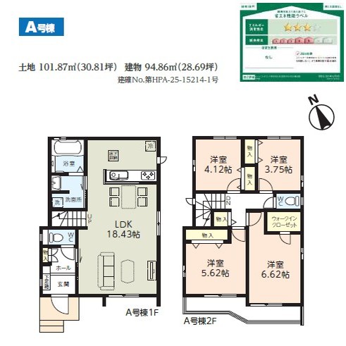 | 間取 | 4LDK~4LDK + 1.2階ホール収納・リビング階段・WIC (LDK18.43帖、洋室6.62帖、洋室5.62帖、洋室4.12帖、洋室3.75帖) | ||