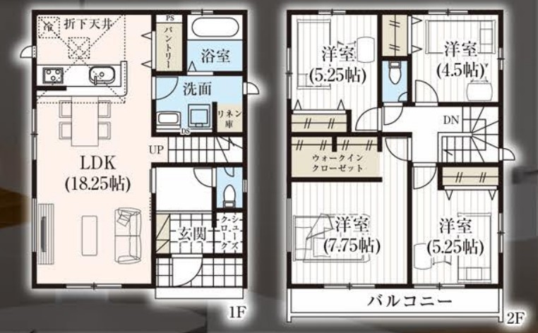 | 間取 | 4LDK + WIC・SC・リネン庫・パントリー・ワイドバルコニー (LDK18.25帖、洋室7.75帖、洋室5.25帖、洋室5.25帖、洋室4.5帖) | ||