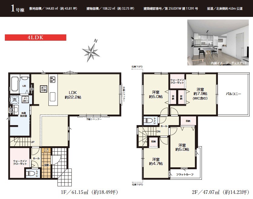 | 間取 | 4LDK + 2WIC (LDK22.2帖、洋室7.9帖、洋室5帖、洋室5帖、洋室4.7帖) | ||