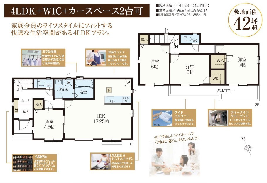 - 駐車2台可能で、衣類以外もたっぷり収納ができる2WIC付き。