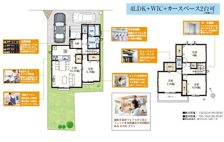 | 間取 | 4LDK + リビング収納、WIC、2階ホール収納 (LDK16.25帖、洋室5.75帖、洋室7.25帖、洋室6.06帖、洋室6帖) | ||