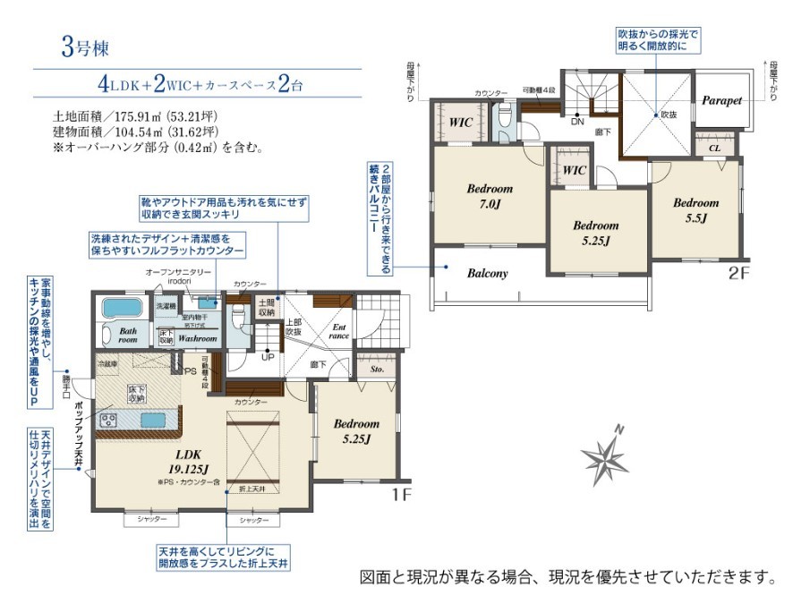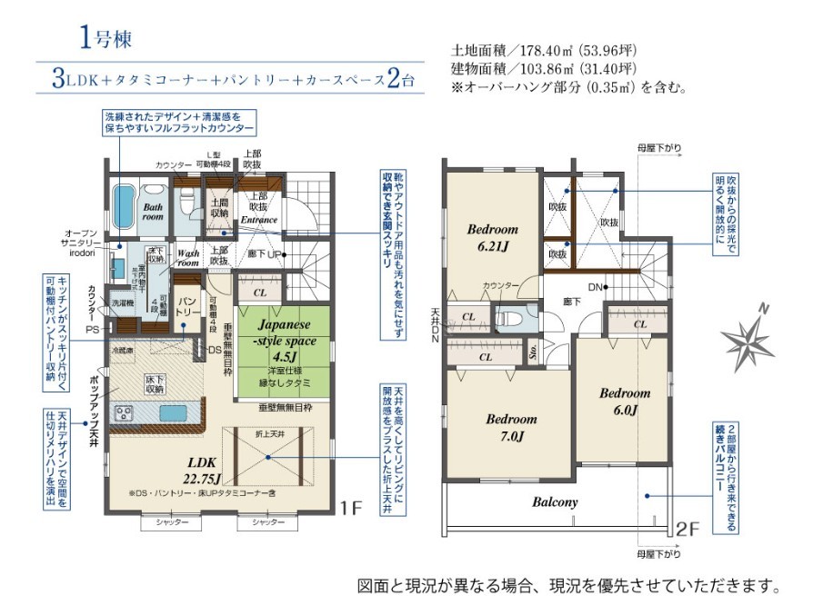 | 間取 | 3LDK~4LDK + SIC・パントリー・2階ホール収納・タタミコーナー (LDK22.75帖、洋室7帖、洋室6帖、洋室6.21帖) | ||