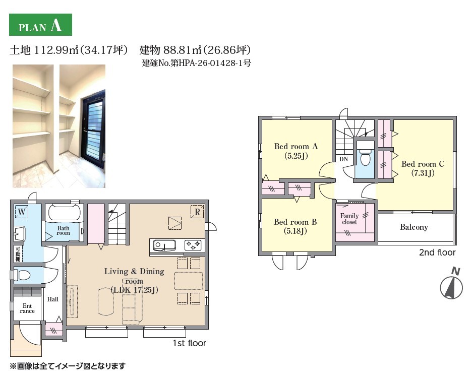 | 間取 | 3LDK + 玄関ホール収納、リビング収納、ファミリークローゼット (LDK17.25帖、洋室7.31帖、洋室5.25帖、洋室5.18帖) | ||