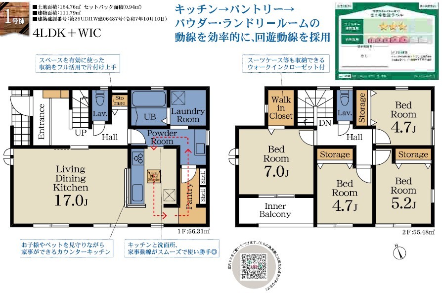 | 間取 | 4LDK + WIC・パントリー・ホール収納 (LDK17帖、洋室7帖、洋室5.2帖、洋室4.7帖、洋室4.7帖) | ||