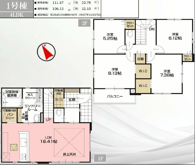 | 間取 | 4LDK + SIC・パントリー・2WIC・リビング階段・2階ホール収納 (LDK18.41帖、洋室8.13帖、洋室7.38帖、洋室6.12帖、洋室5.25帖) | ||