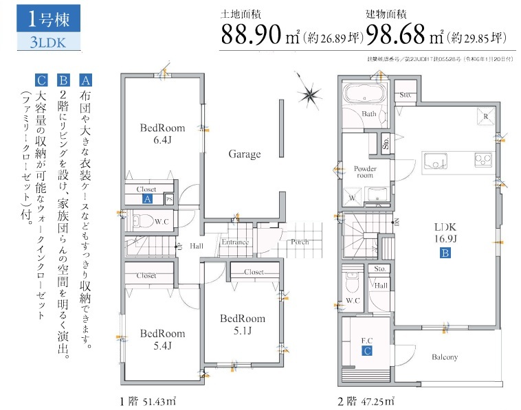 | 間取 | 3LDK + オール電化・2階リビング・インナーガレージ・FC (SLDK16.9帖、洋室6.4帖、洋室5.4帖、洋室5.1帖) | ||