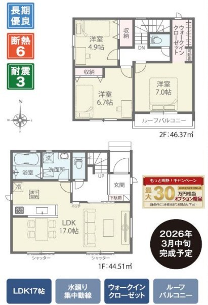 | 間取 | 3LDK~3LDK + 長期優良住宅・駐車2台可・WIC・ルーフバルコニー (LDK17帖、洋室7帖、洋室6.5帖、洋室4.5帖) | ||