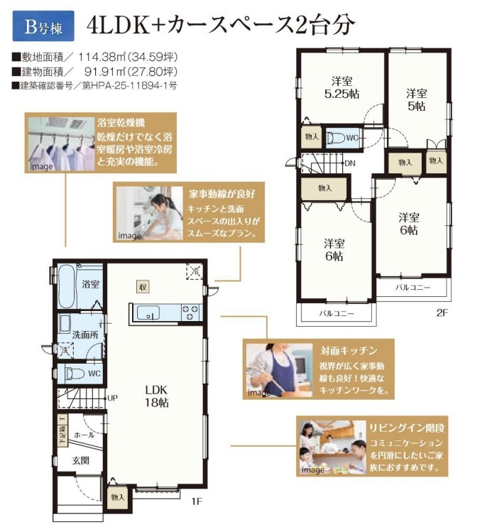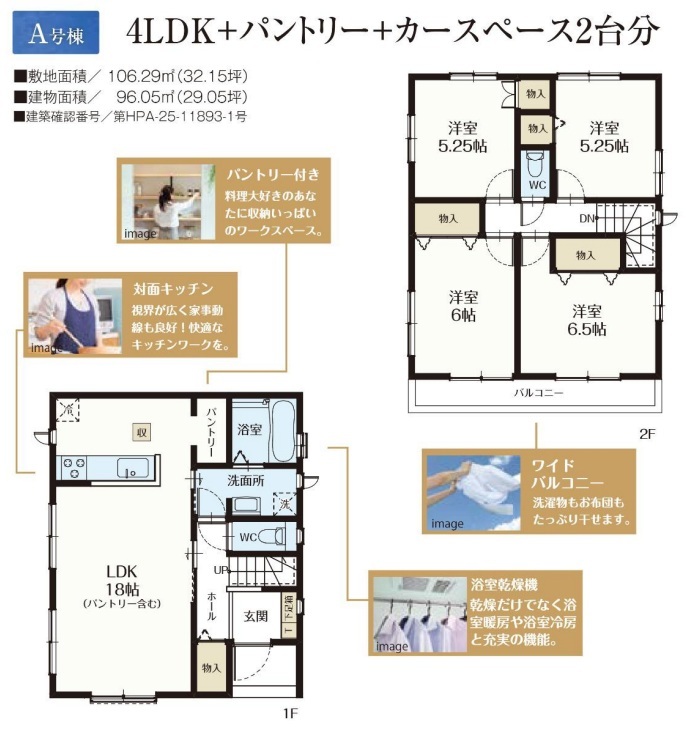 | 間取 | 4LDK~4LDK + 駐車2台・パントリー・ワイドバルコニー・ (LDK18帖、洋室6.5帖、洋室6帖、洋室5.25帖、洋室5.25帖) | ||