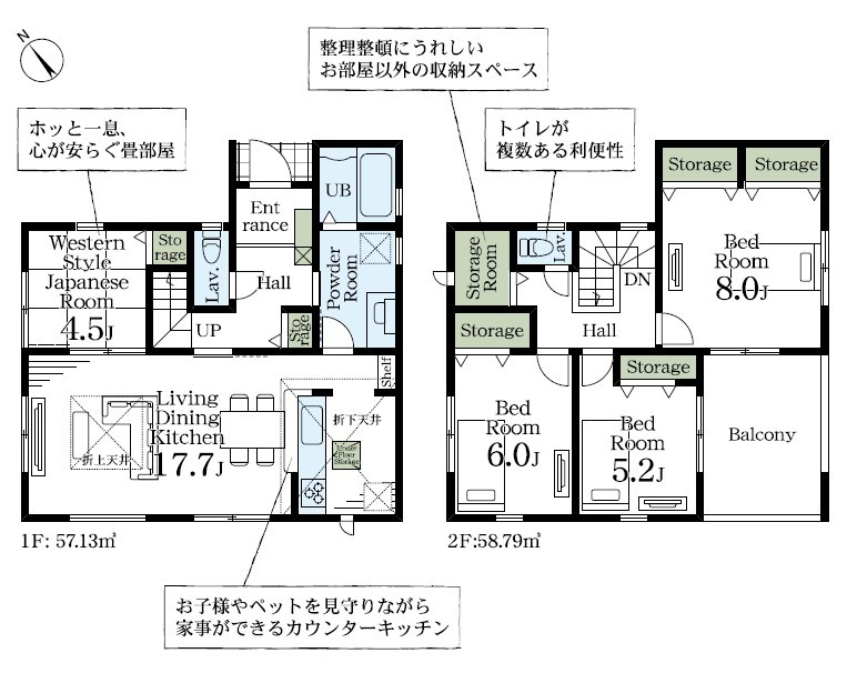 | 間取 | 4SLDK + ホール収納・畳・ストレージルーム (LDK17.7帖、洋室8帖、洋室6帖、洋室5.2帖) | ||