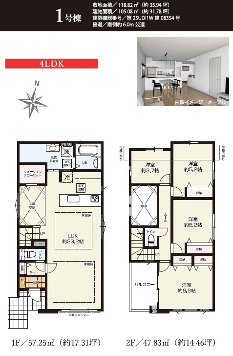 | 間取 | 4LDK~4LDK + WIC・リビング階段・吹抜け (LDK23.2帖、洋室6.6帖、洋室5.2帖、洋室5.2帖、洋室3.7帖) | ||