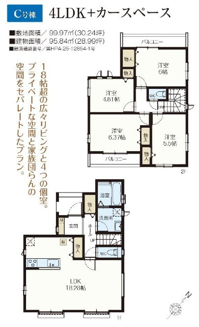 | 間取 | 4LDK~4LDK + 1階ホール収納・リビング収納 (LDK18.28帖、洋室6.37帖、洋室6帖、洋室5.5帖、洋室4.81帖) | ||
