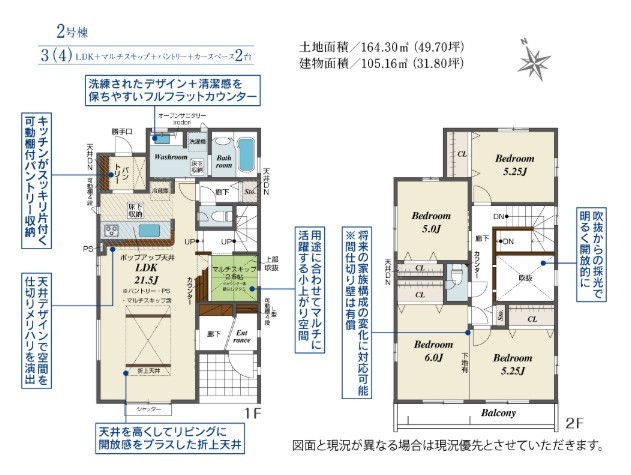 | 間取 | 4LDK~4LDK + パントリー、土間収納、2WIC、2階ホール収納 (LDK19.25帖、洋室5帖、洋室7.5帖、洋室6帖、洋室5.25帖) | ||
