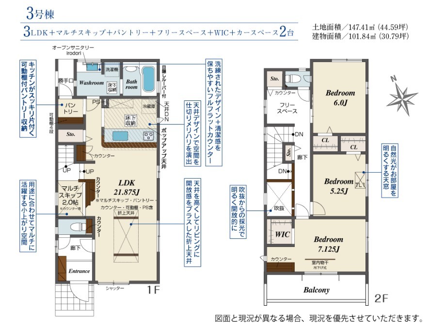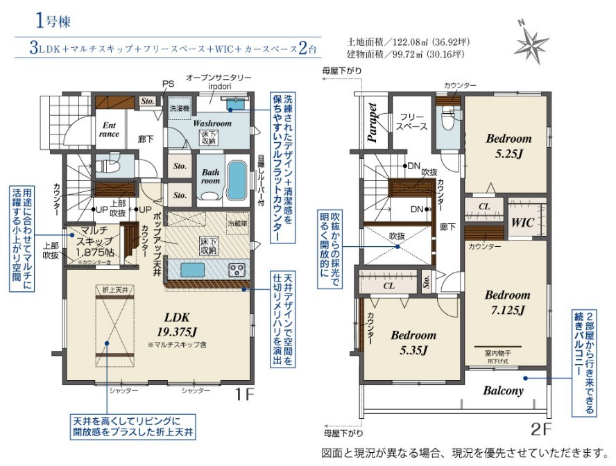 | 間取 | 3LDK~4LDK + 折上天井・マルチスキップ・フリースペース・WIC (LDK19.375帖、洋室7.125帖、洋室5.35帖、洋室5.25帖) | ||