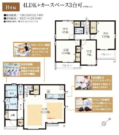 | 間取 | 4LDK + ホール収納・リビング収納・リビング階段 (LDK19.37帖、洋室7.25帖、洋室6.06帖、洋室5帖、洋室4.5帖) | ||