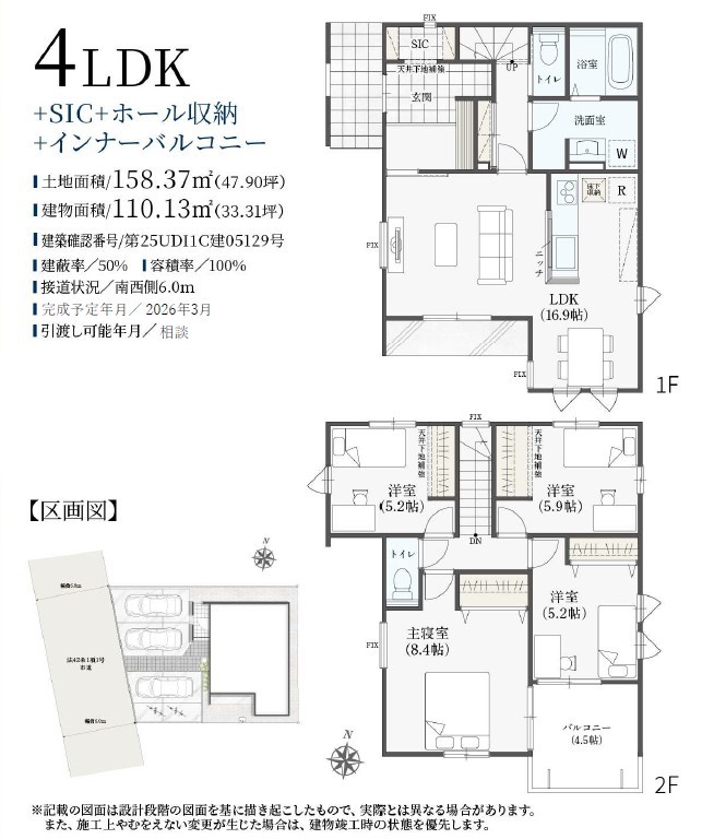 | 間取 | 4LDK + SIC・ホール収納 (LDK16.9帖、洋室8.4帖、洋室5.9帖、洋室5.2帖、洋室5.2帖) | ||