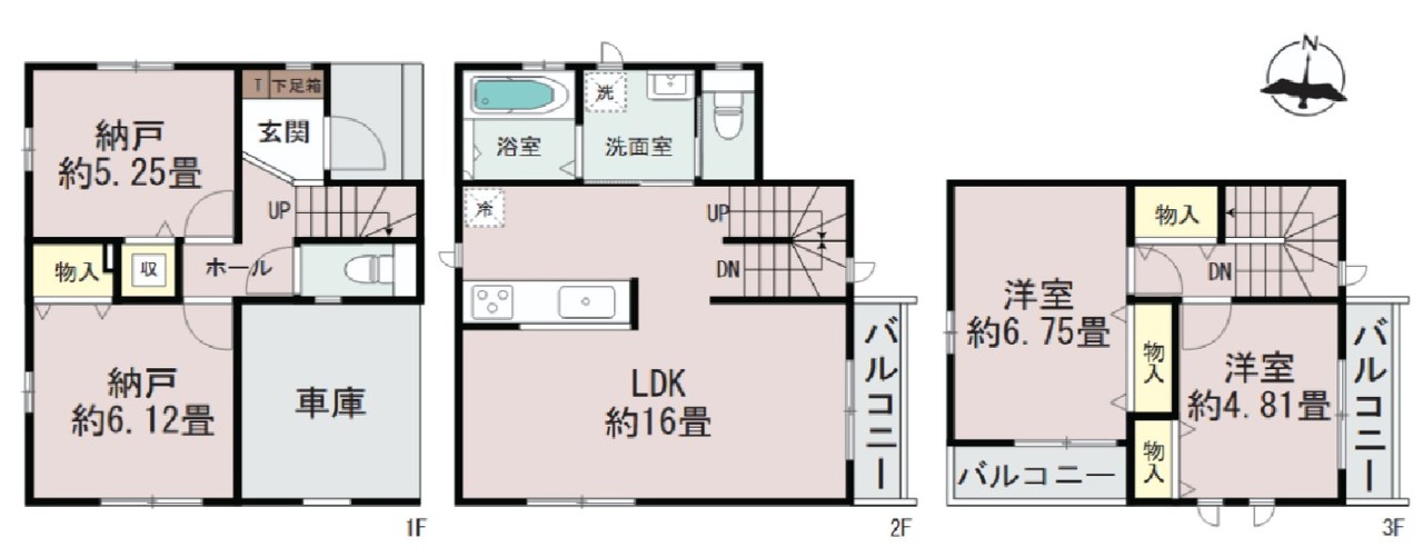 | 間取 | 2SLDK + 納戸×2・2階リビング・バルコニー×3 (LDK16帖、洋室6.75帖、洋室4.81帖、S6.12帖、S5.25帖) | ||