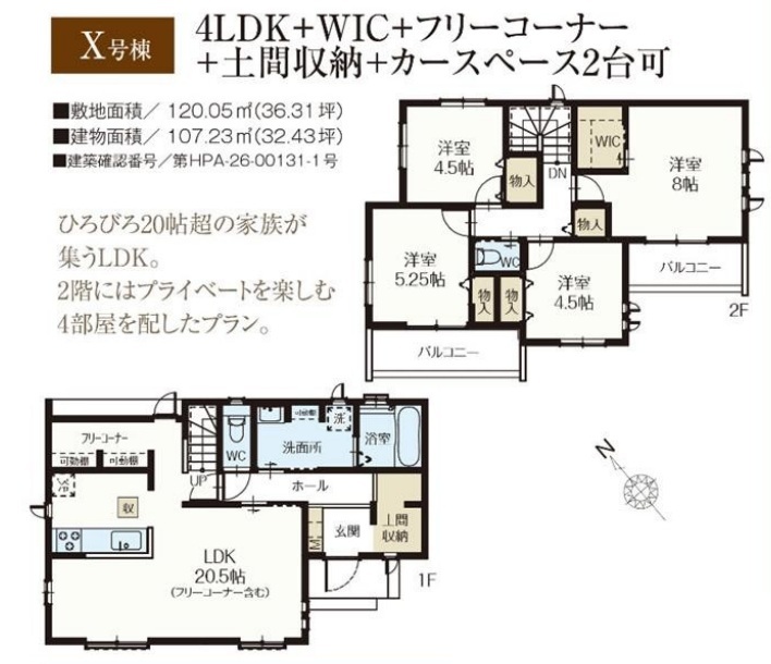 | 間取 | 4LDK + P2台可能・WIC・土間収納・ホール収納・ワイドバルコニー (LDK20.5帖、洋室8帖、洋室5.25帖、洋室4.5帖、洋室4.5帖) | ||