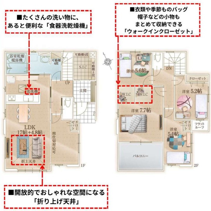 2号棟 敷地広々55坪で並列駐車2台可能 お洒落な折上天井やあると便利な食洗機・室物干しなど設備充実 WIC・SIC・全居室収納付きでお荷物スッキリ 是非、印西市内で新築一戸建てをお探しの方はお気軽にお問い合わせください。 お待ちしております。 ※外観イメージパース