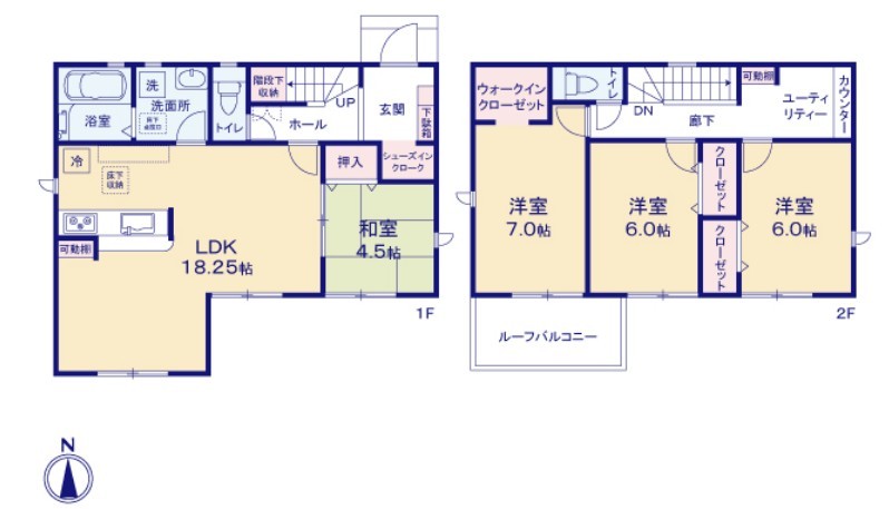 | 間取 | 4LDK + 和室・全居室南向き・WIC・SIC・階段下収納 (LDK18.25帖、洋室7帖、洋室6帖、洋室6帖、和室4.5帖) | ||