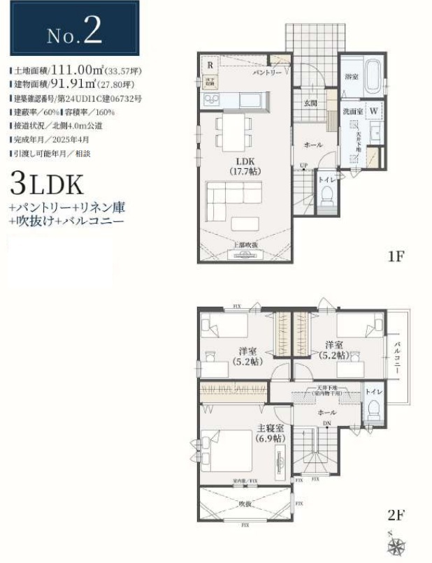 | 間取 | 3LDK + 吹抜・パントリー・リネン庫・ワイドバルコニー (LDK17.7帖、洋室6.9帖、洋室5.2帖、洋室5.2帖) | ||