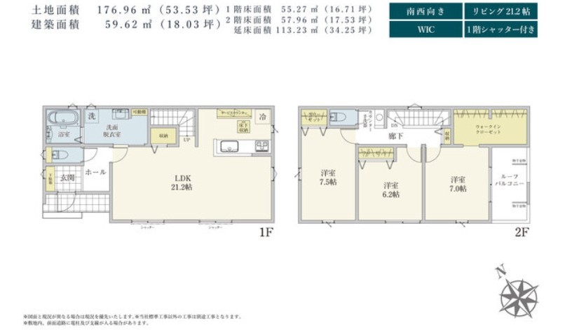 | 間取 | 3LDK~4LDK + 駐車2台可能・WIC・リビング収納・ホール収納・ルーフバルコニー (LDK21.2帖、洋室7.5帖、洋室7帖、洋室6.2帖) | ||