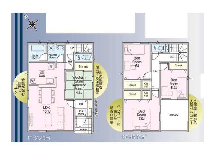 | 間取 | 4LDK~4LDK + 2階ホール収納・WIC (LDK16帖、和室5帖、洋室7.5帖、洋室6.5帖、洋室5.2帖) | ||