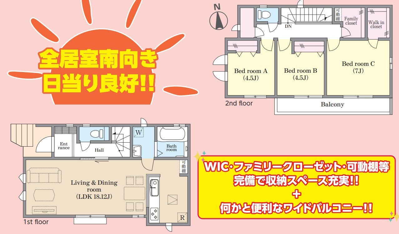 | 間取 | 3LDK + 全居室南向き・WIC・ファミリークローゼット・可動棚・ワイドバルコニー (LDK18.12帖、洋室7帖、洋室4.5帖、洋室4.5帖) | ||