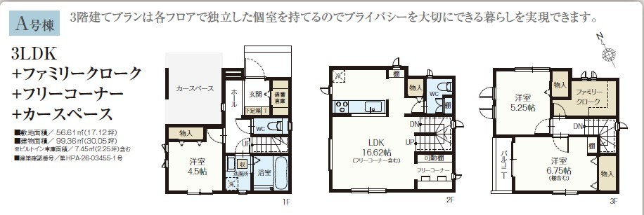 | 間取 | 3LDK~3LDK + 備蓄倉庫、キッチン収納、フリーコーナー、Fクローク (LDK16.62帖、洋室6.75帖、洋室5.25帖、洋室4.5帖) | ||