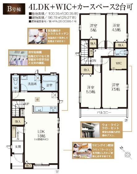 | 間取 | 4LDK~4LDK + リビング階段・リビング収納・WIC (LDK18帖、洋室7.5帖、洋室5.5帖、洋室5帖、洋室4.5帖) | ||
