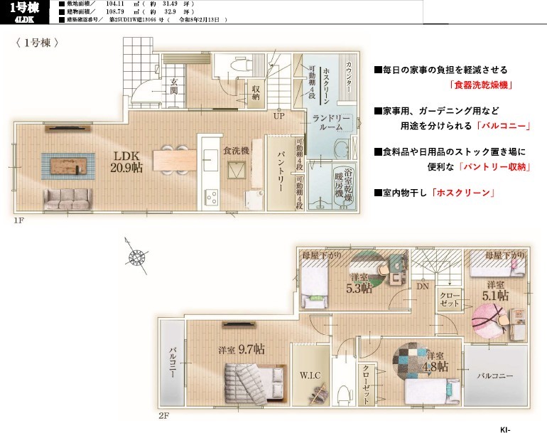 | 間取 | 4LDK + 玄関ホール収納、パントリー、ランドリールーム、WIC (LDK20.9帖、洋室9.7帖、洋室5.3帖、洋室5.1帖、洋室4.8帖) | ||