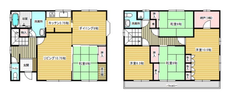 | 間取 | 5SLDK + オール電化・納戸・駐車3台可能・令和元年内外装リフォーム済 (LDK10.75帖、D8帖、和室6帖、洋室10.5帖、洋室6.3帖、和室6帖、和室6帖、S3帖) | ||