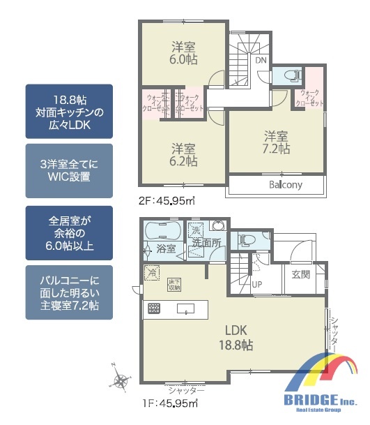 | 間取 | 3LDK + リビングカウンター、リビング収納、キッチン収納付き (LDK18.8帖、洋室7.2帖、洋室6.2帖、洋室6帖) | ||